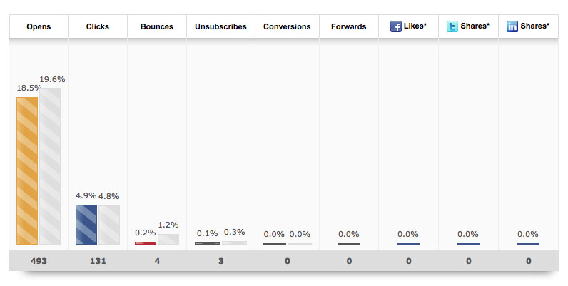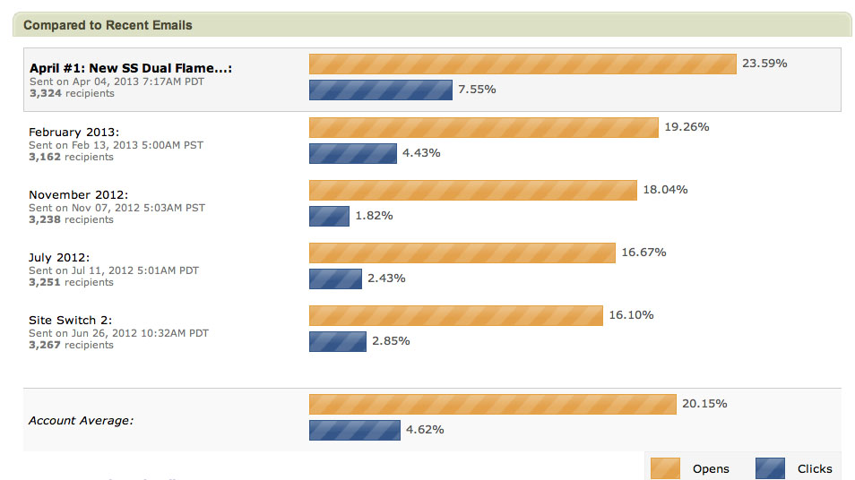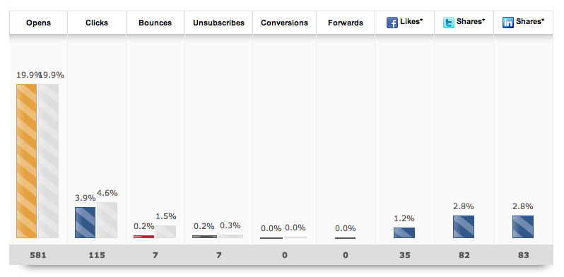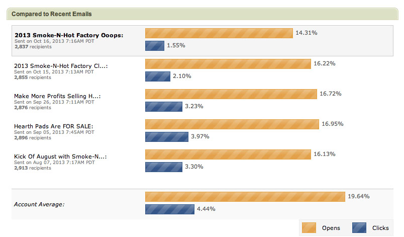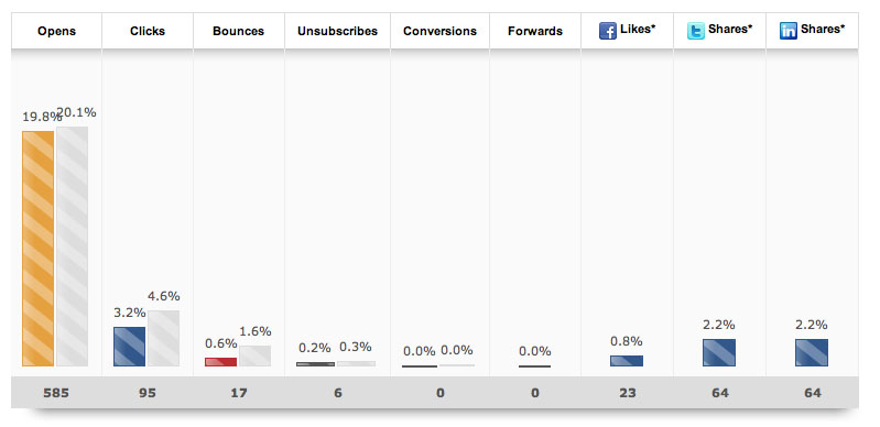 Actual OPENS jumped up to 19.75% as compared to 18.88% for the previous blast. Or, 585 actual opens as compared to 566.